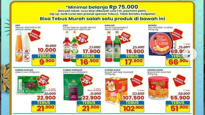 - Belanja senilai Rp50.000 (kecuali rokok, susu bayi, di bawah usia 1 tahun payment point, top up, tarik tunai dan produk sponsor Tebus Heboh) bisa Tebus Murah 9 produk yang berbeda