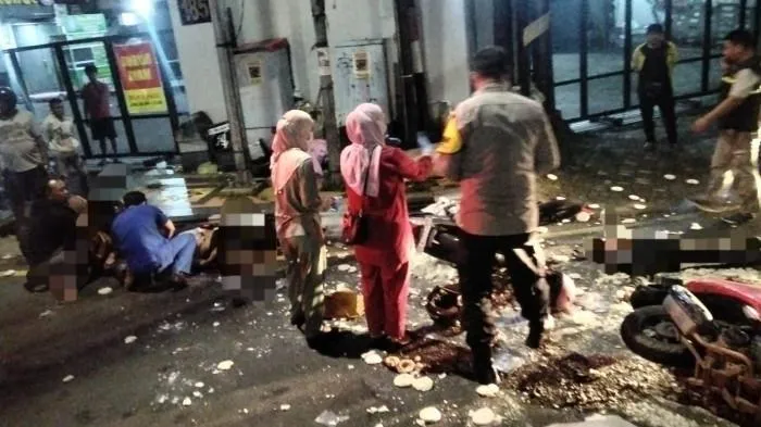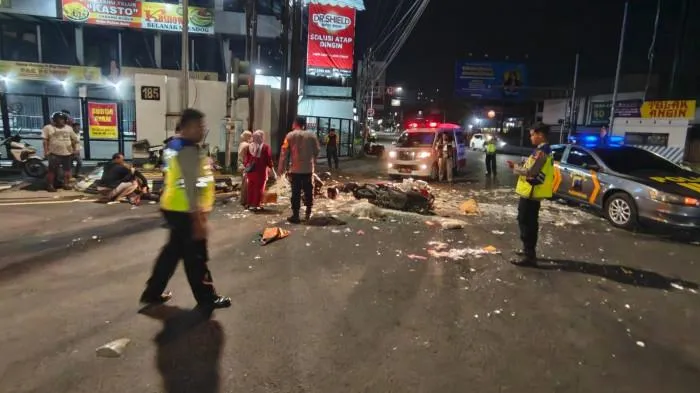 Kedua kendaraan tergeletak, sementara para pengendara dan penumpang terpental ke jalan.