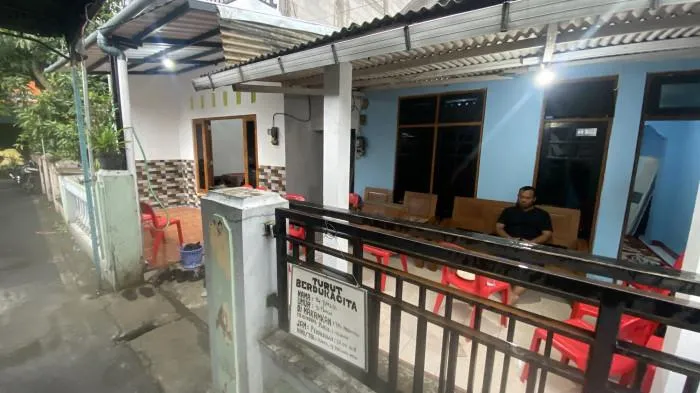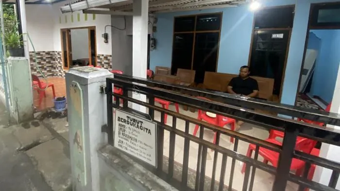 Deretan kursi disusun di depan teras, tenda sederhana berdiri, dan bendera kuning terpasang di mulut gang. Tanda rumah itu sedang berduka.