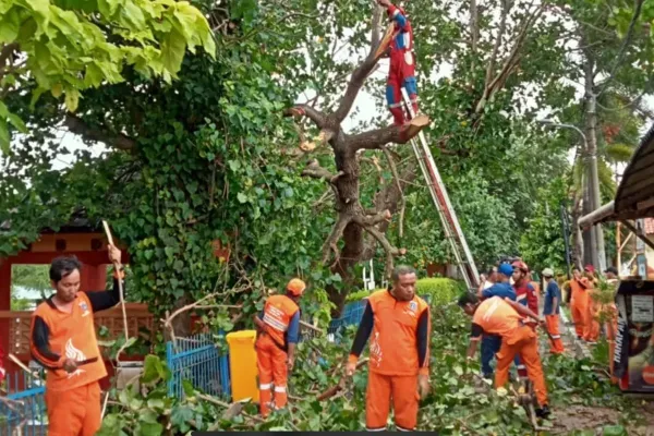 Pohon jenis Waru dengan tinggi sekira 20 meter itu tumbang dan menimpa atap warung milik warga, serta memutus akses Jalan Raden Ronggo, Kelurahan Prenggan.