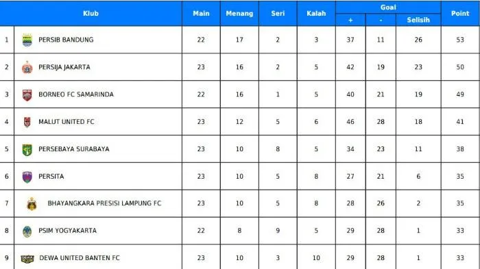 Persib Bandung berada di posisi pertama dengan raihan 54 poin dari 23 pertandingan.