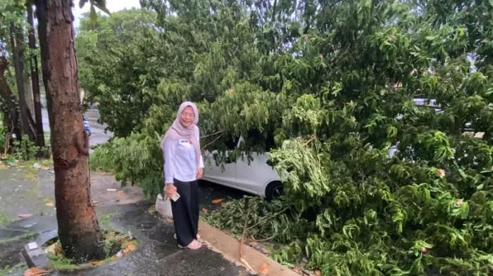 Beberapa dahan pohon berukuran besar patah hingga menimpa motor serta mobil yang sedang melintas.