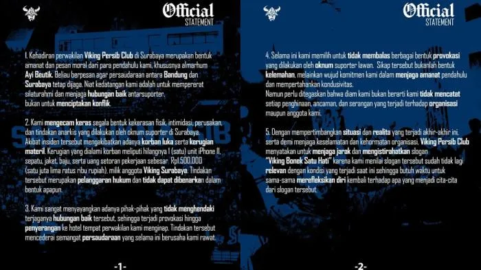 Dalam pernyataan resminya, Viking menyampaikan lima poin sikap yang mengecam segala bentuk kekerasan yang menyebabkan Bobotoh mengalami luka fisik hingga kerugian materi.