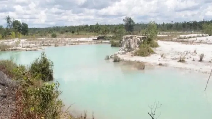 Bekas tambang emas yang jadi danau biru estetik, cocok untuk foto dramatis.