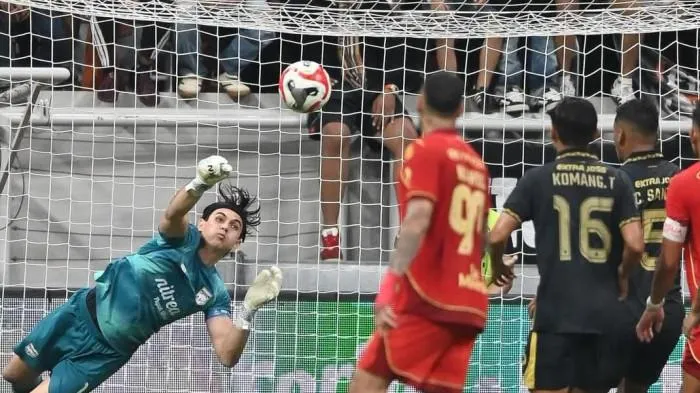 Namun tendangan jarak dekat yang dilepaskannya masih melambung di atas mistar gawang Nadeo Argawinata.