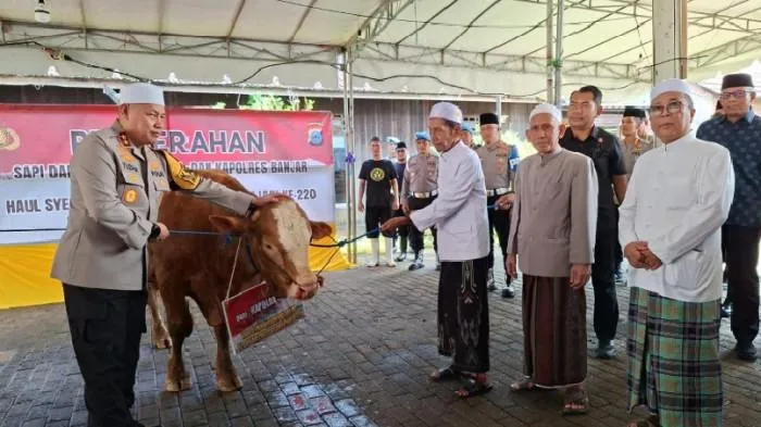 Sapi untuk konsumsi jemaah haul tersebut diserahkan langsung oleh Kapolda Kalsel, Irjen Pol Rosyanto Yudha Hermawan kepada panitia haul di halaman Masjid Tuhfaturroghibin, Selasa (24/3/2026).