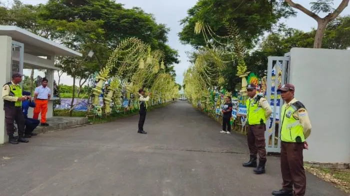 Puluhan janur kuning ditata rapi di tepian jalan masuk yang diatur dengan sistem one way.