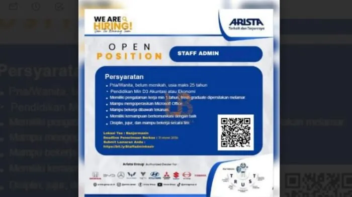 Batas pendaftaran lowongan kerja ini dibuka paling lambat hingga 31 Maret 2026.