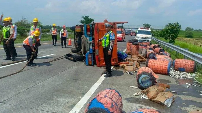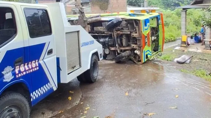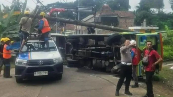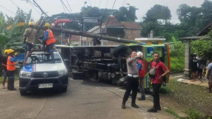 Kendaraan yang mengangkut rombongan halal bihalal itu diduga tidak kuat menanjak hingga mundur tak terkendali dan menabrak tiang listrik.
