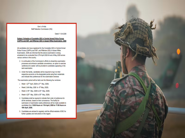 SSC GD Constable Exam 2026 Schedule: There is a major update for candidates eagerly awaiting the SSC GD exam dates. The Staff Selection Commission has officially announced the examination dates for the GD Constable recruitment. Commencing on April 27, the examination will be conducted in four phases, extending through the last week of May. According to the official notice released on the SSC's official website (ssc.gov.in), the examination for the first week will be held from April 27 to May 2, 2026. Following this, the examination for the second week will take place from May 4 to May 9. The subsequent schedule has been determined in a similar manner.