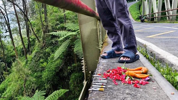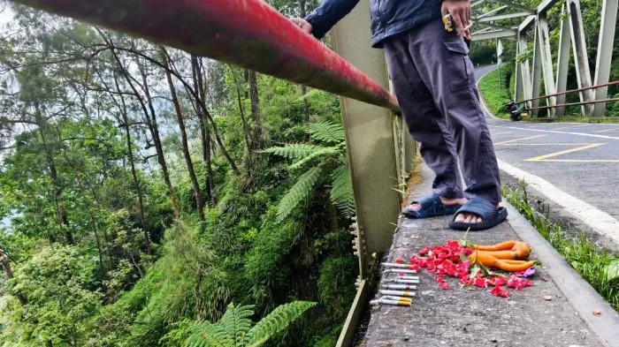 TRIBUNJATIM.COM, MOJOKERTO - Fenomena tak biasa terjadi di Jembatan Cangar, jalur alternatif Mojokerto–Batu. Lokasi ini mendadak viral setelah banyak pengunjung datang dan meletakkan berbagai benda seperti rokok, bunga, jajanan, hingga kopi di atas jembatan.