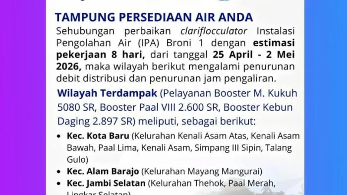 Diperkirakan perbaikan clariflocculator di Instalasi Pengolahan Air (IPA) Broni 1 akan berlangsung selama 8 hari, yakni mulai 25 April hingga 2 Mei 2026.